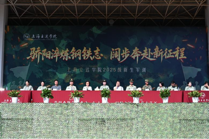 2025级新生军训开营仪式在此庄严举行,武警上海总队机动第一支队四大队大队长张曾勋、副教导员何鹏率领全体教官出席仪式;学