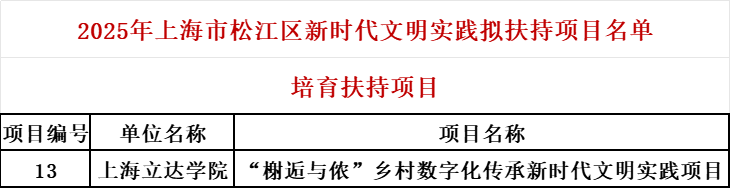 本年度扶持项目中,获批重点扶持项目9项、培育扶持项目13项。上海立达学院党委宣传部《“榭逅与侬”乡村数字化传承新时代文明实践项目》获批培育扶持项目,成为上海松江区四所被扶持高校之一,我校应加快精神文明建设,积极配合政府完成扶持项目。