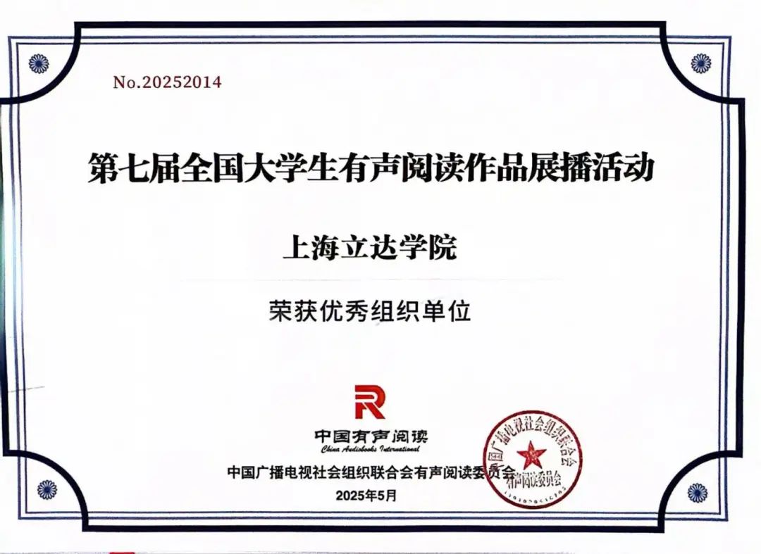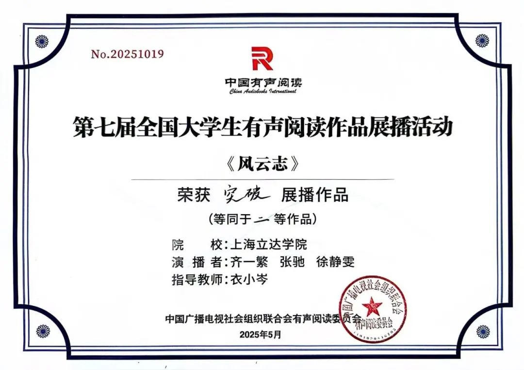 本次活动共收到100多所院校的千余件作品。经过初评,60部优秀作品成功晋级落地展演。我校播音与主持艺术专业22级学生齐一繁、张驰、23级学生徐静雯带着复赛作品《风云志》,决赛作品《木构暗语》经过层层比拼勇夺全国二等奖!衣小岑老师荣获优秀指导教师奖,上海立达学院斩获优秀组织单位奖,三项重磅荣誉齐落立达,为学校再添熠熠光彩!