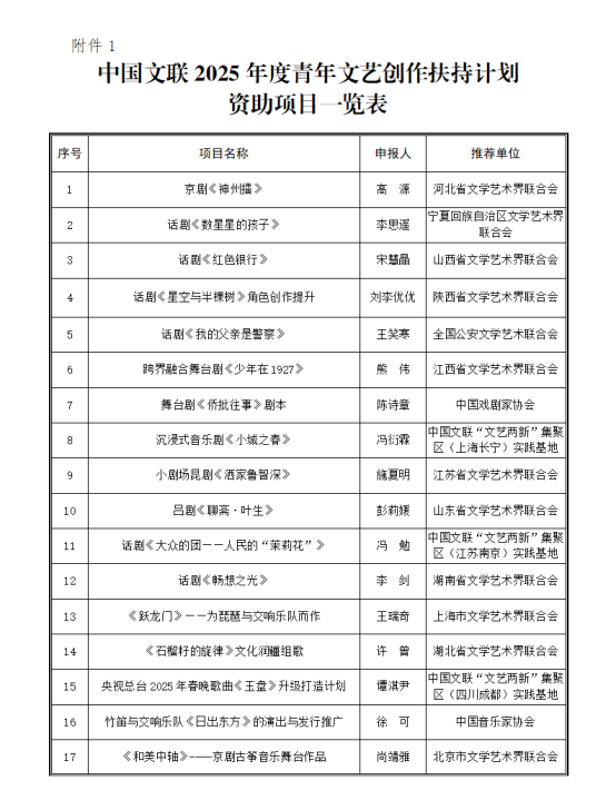 2025年中国文联继续实施青年文艺创作扶持计划,全国广大青年文艺工作者聚焦舞台艺术,踊跃申报,中国文联各团体会员、有关直属单位和中国文联“文艺两新”集聚区实践基地积极推荐,经中国文联2025年度青年文艺创作扶持计划评审委员会评审,并报中国文联书记处审批同意,确定中国文联2025年度青年文艺创作扶持计划立项项目43个,其中资助类项目29个,支持类项目14个。该项目鼓励在文艺创作中大胆融合新技术、新手段,为文艺工作者在创作实践、研修培训、成果展示、宣传推广、评奖推优等方面提供支持和服务,推动构建各方面。