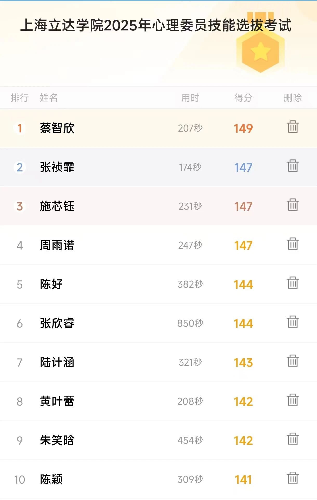 经过系统自动评分(同分情况下答题用时短者排名优先),最终共有10名同学凭借扎实的知识和稳定的发挥成功晋级校级决赛。他们在此次初赛中“锋芒初露”,荣获“锋芒初露之星”称号。