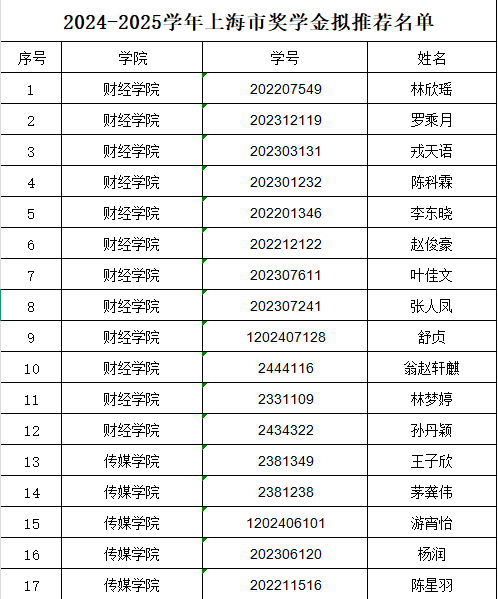 根据《上海市教育委员会 上海市财政局 上海市退役军人事务局 上海市人民政府征兵办公室关于印发<上海市普通高等学校学生资助资金管理实施办法>的通知》(沪教委规〔2025〕8号)、《上海市教育委员会关于下达2025年普通本科高校、高等职业学校上海市奖学金计划的通知》(沪教委学〔2025〕57号)等文件精神,本着“公平、公正、公开”的原则,经学生自愿申请、班级推荐、二级学院审核推荐、学校学生资助管理中心复核、学校奖学金评审委员会评审,现拟推荐财经学院林欣瑶等49位同学申请上海市奖学金。